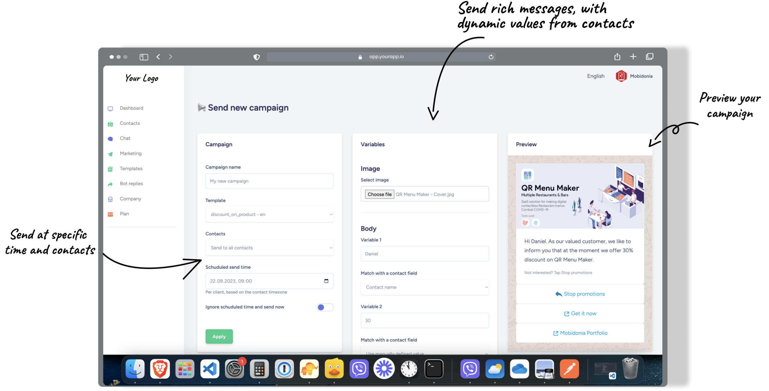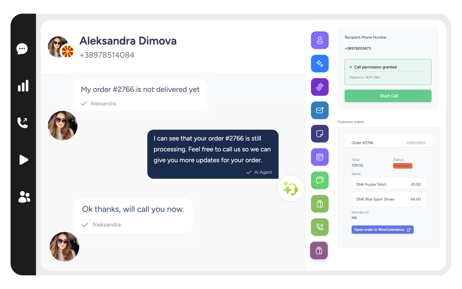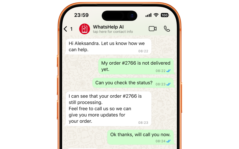 Powerful chat system designed for support teams. Send documents, images, videos, and use quick replies to resolve customer issues faster. Assign conversations to specific agents, set priorities, and track response times. Built-in templates help your team provide consistent, professional support.